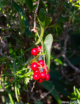 There were several clumps of the foliose lichen Parmotrema perforatum on the branch. This gray green lichen has a leaf-like structure with black filaments called cilia along its margins. These cilia probably act to catch dew for the rootless lichen.
