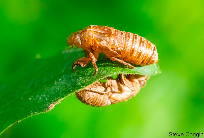 Then the Periodical Cicadas begin to emerge. The fifth nymph stage digs tunnels through the soil and crawls up tree trunks, shrubs and even stout grasses. The back of the nymph exoskeleton splits, and the winged adult crawls out. Over the course of a couple of hours the cicadas pump fluid to expand their wings to their full size and their exoskeleton hardens. Then the Periodical Cicadas fly off to complete their life cycle.